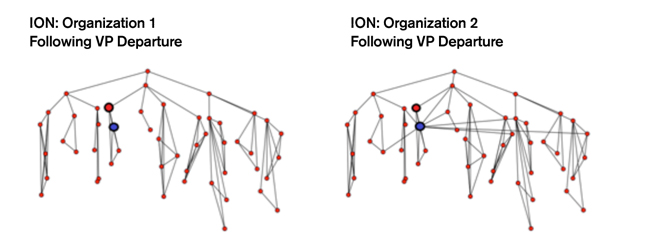This risk is illustrated in the following graphs, which depict each organization under the assumption that the VP of finance has left the company, and has been replaced by an individual who assumes similar responsibilities, but, being new to the organization, has few organic connections.