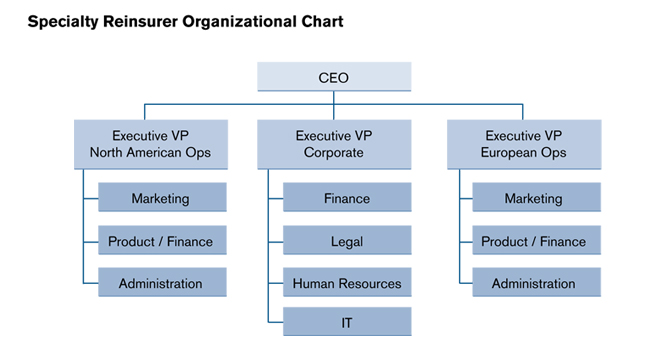 The official organization chart for this reinsurer, shown in the diagram in Figure 1, reflects operations divided into European and North American units, both of which are responsible for local marketing, product design, and administration. A corporate unit coordinates activities, is responsible for financial reporting and risk management, and provides legal, HR, and IT services.