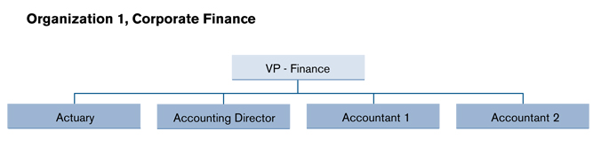 Under Organization 1, corporate finance has five professional employees: a VP of finance, an actuary, and three additional accounting professionals. The corporate finance organization can be represented by the simple tree shown in Figure 2.