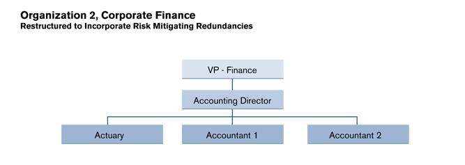 Under Organization 2, there is exactly one change in management structure and a corresponding change in philosophy. One of the accounting professionals, the accounting director, is given an expanded role. With the revised structure, the accounting director is responsible for functions similar to those under Organization 1, but now shares higher-level management responsibilities with the VP of finance. This builds in an important redundancy, as will be clear from the ION analysis.